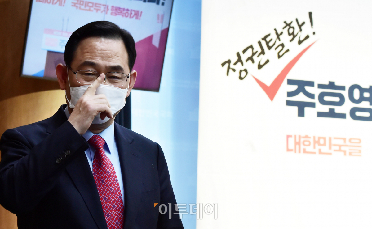 주호영 국민의힘 전 원내대표(의원)가 10일 서울 여의도 국회 소통관에서 열린 6월 전당대회 출마선언관련 기자회견을 마치고 단상에서 내려오고 있다.