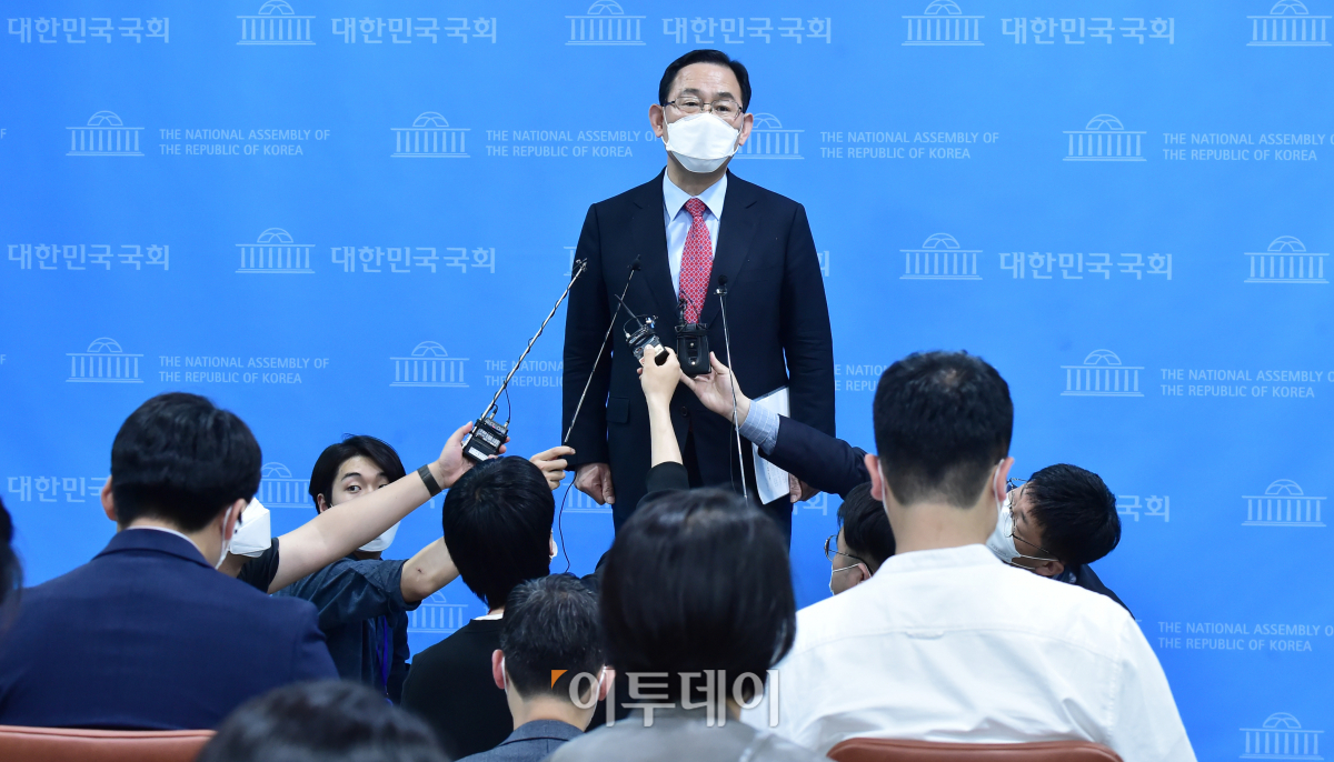주호영 국민의힘 전 원내대표(의원)가 10일 서울 여의도 국회 소통관에서 열린 6월 전당대회 출마선언관련 기자회견을 마치고 취재진 질문을 받고 있다.