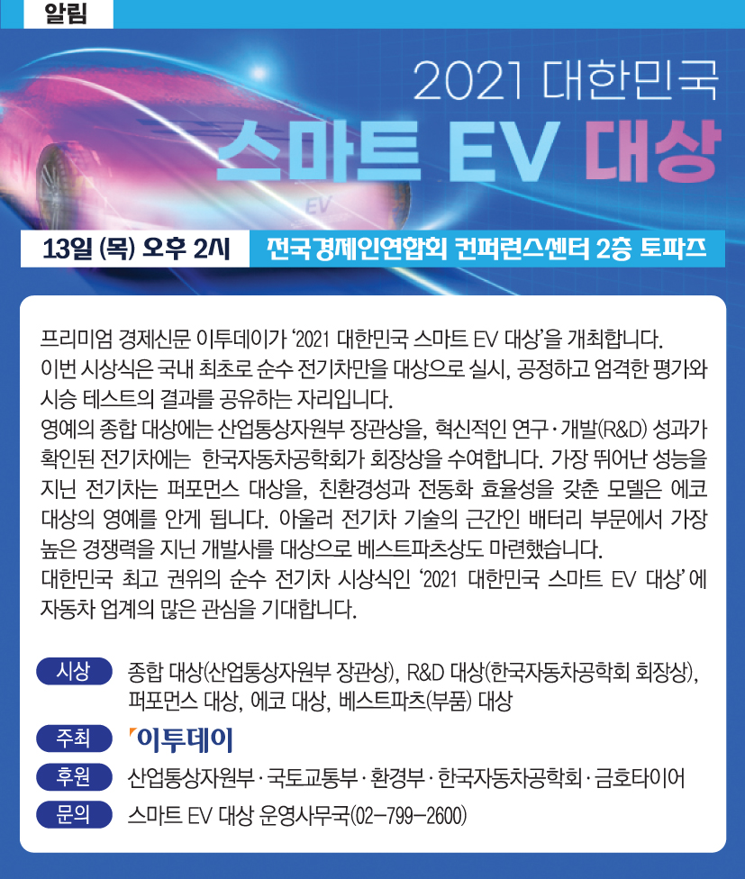 2021 대한민국 스마트 EV 대상 시상…국산ㆍ수입 전기차 12차종 경쟁