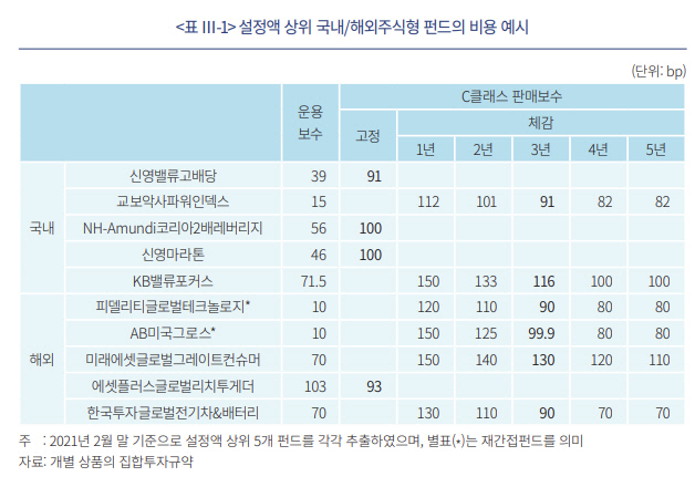 특히 판매수수료의 부담이 크다. 2020년 10월 말 기준 주식형 공모펀드의 판매보수는 0.43%, 운용보수는 0.45%로 운용보수만큼 높은 판매보수를 가져가고 있다.