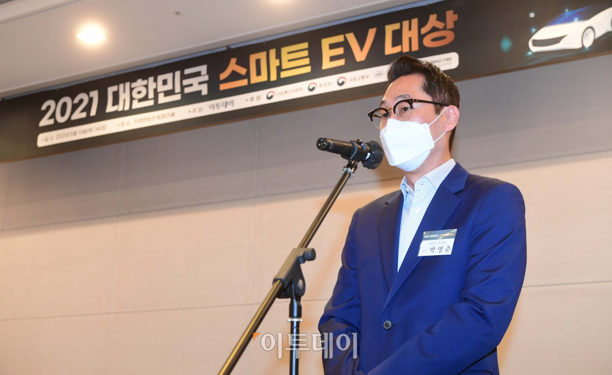 13일 서울 여의도 전경련회관에서 열린 ‘2021 대한민국 스마트 EV 대상’에서 e-트론으로 R&D 대상을 수상한 아우디 코리아의 박영준 상무가 수상소감을 밝히고 있다. 이투데이가 주최하고 산업부, 환경부, 국토부, 자동차공학회, 금호타이어가 후원한 ‘2021 대한민국 스마트 EV 대상’은 이 시대 새로운 패러다임으로 떠오른 전기차를 진단하고, 자동차 산업이 나아갈 방향성을 제언하기 위해 기획됐다.