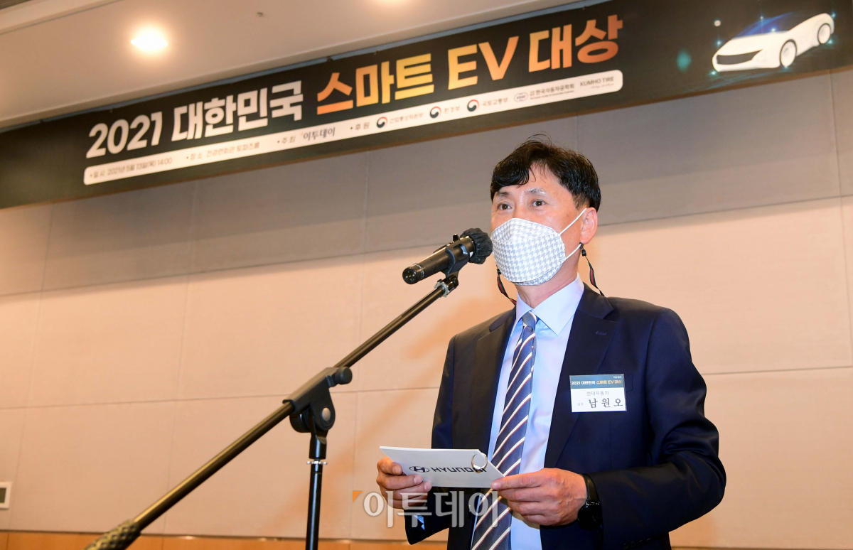 13일 서울 여의도 전경련회관에서 열린 ‘2021 대한민국 스마트 EV 대상’에서 아이오닉 5로 대상을 수상한 현대차의 남원오 전무가 수상소감을 밝히고 있다. 이투데이가 주최하고 산업부, 환경부, 국토부, 자동차공학회, 금호타이어가 후원한 ‘2021 대한민국 스마트 EV 대상’은 이 시대 새로운 패러다임으로 떠오른 전기차를 진단하고, 자동차 산업이 나아갈 방향성을 제언하기 위해 기획됐다.