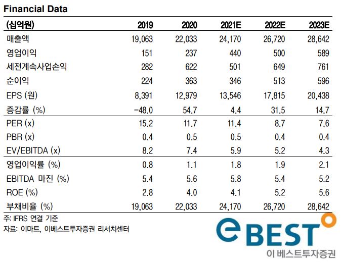 이베스트투자증권은 14일 이마트에 대해 지난해 2분기 재난지원금 사용처에서 제외되면서 발생한 기저효과가 유효하다며 목표주가 21만 원과 투자의견 '매수'를 유지했다.