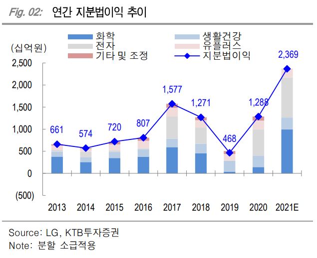KTB투자증권은 14일 LG에 대해 자회사 순익호조로 지분법이익 사상 최대치를 기록했다며 목표주가 14만 원과 투자의견 '매수'를 유지했다.