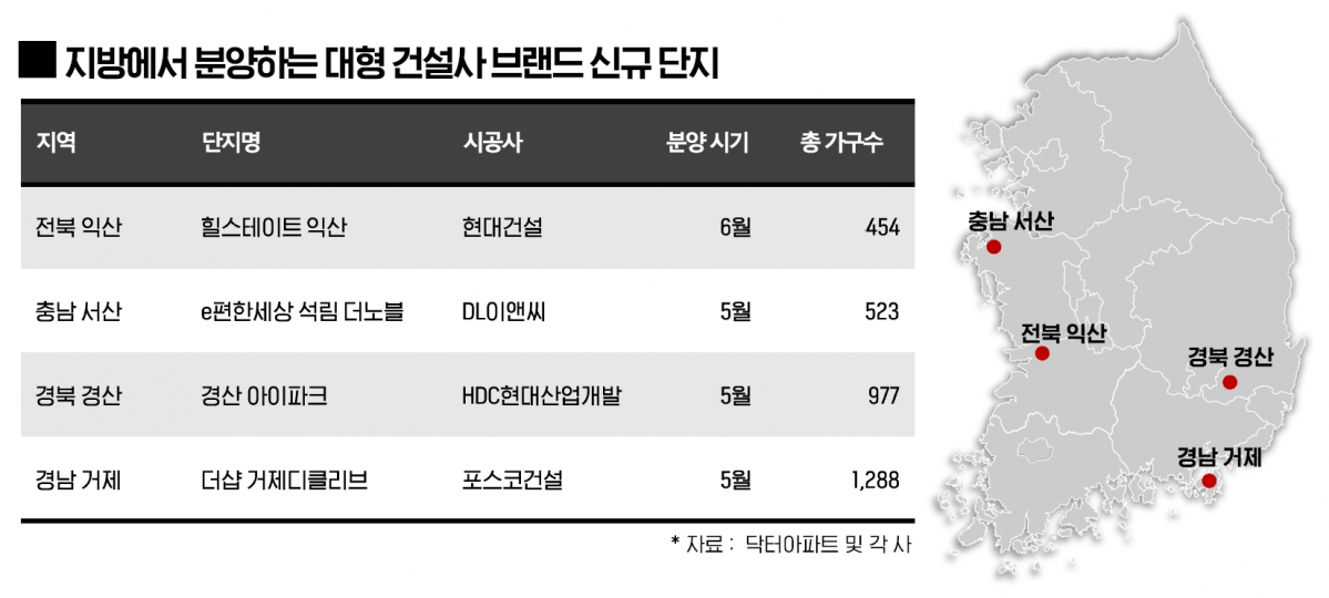 부동산 정보업체 부동산114에 따르면 올 1~4월 시공능력평가순위 1~10위 건설사가 비수도권에서 분양한 아파트는 17개 단지 7797가구다. 이들 단지엔 총 16만6887명이 청약을 신청해 평균 경쟁률이 21.4대 1까지 올랐다.