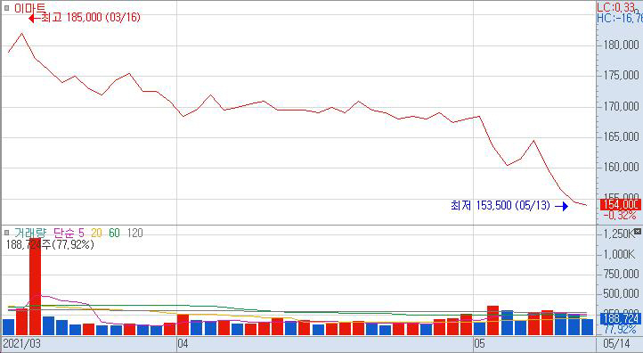 16일 한국거래소에 따르면 이마트 주가는 15만4000원(14일 기준)에 마감했다. 2018년 2월 1일 최고가 32만3500원의 절반 수준으로 실적에 비해 다소 아쉽다.