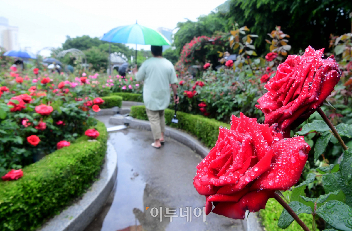 전국에 비가 내린 16일 서울 중랑구 중랑천 일대에서 열린 ‘2021 서울장미축제’를 찾은 시민들이 꽃길을 걷고 있다. 올해 서울장미축제는 코로나19 확산 방지를 위해 16개 동에서 분산 진행되며 오는 31일까지 열린다.