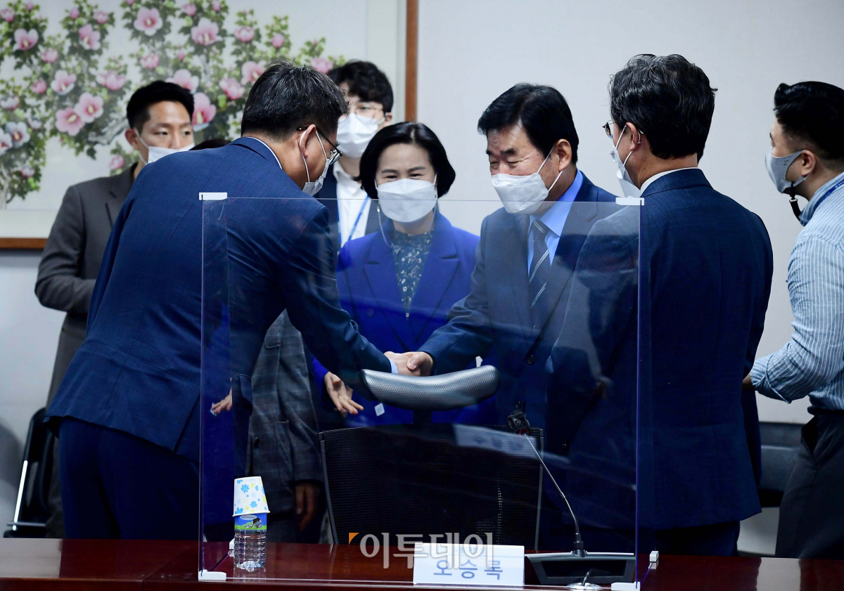 17일 서울 여의도 국회에서 열린 ‘더불어민주당 부동산특별위원회-서울시 구청장 정책현안 회의’에서 김진표(오른쪽) 특위 위원장과 오승록 노원구청장이 인사하고 있다.