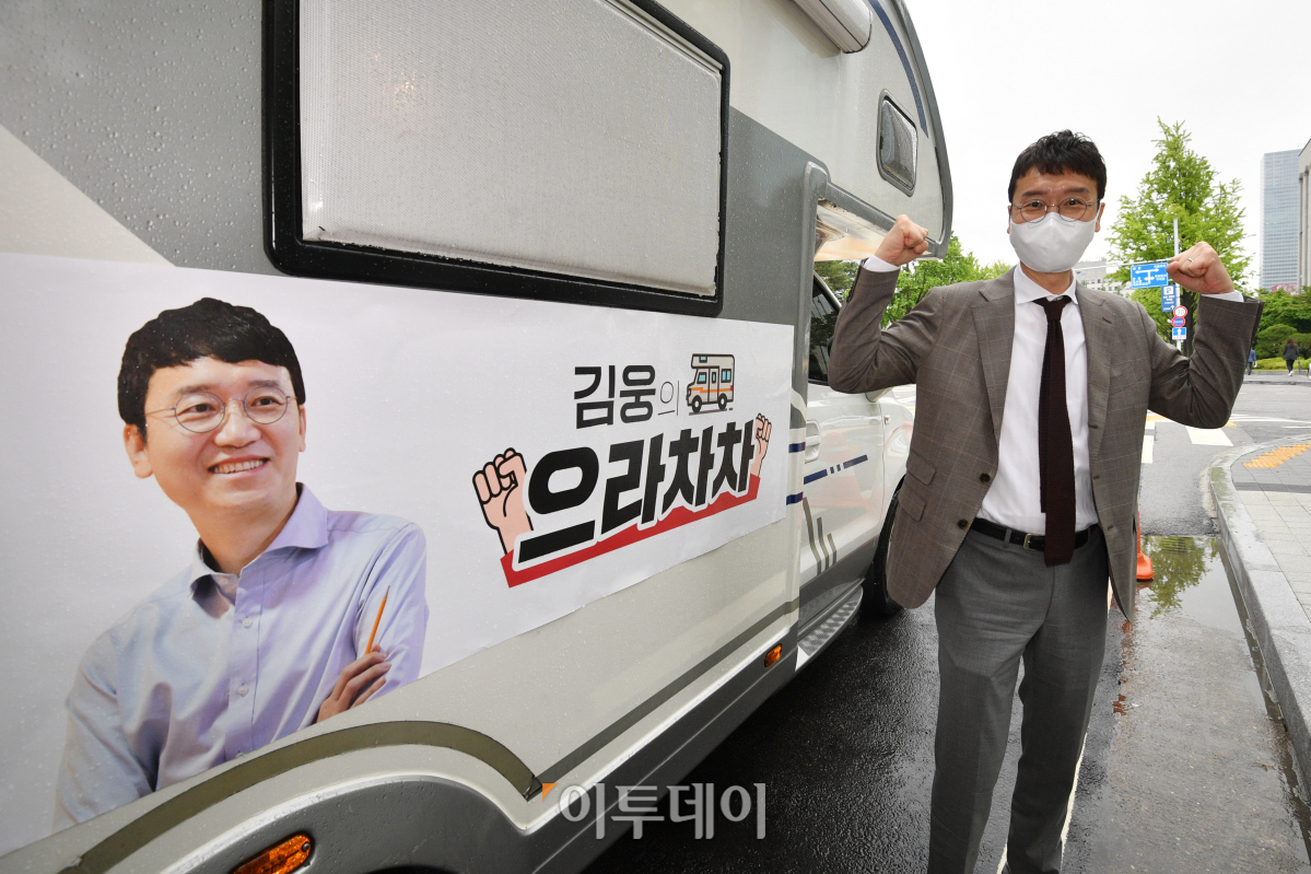 국민의힘 당대표 선거 출마를 선언한 김웅 의원이 17일 오후 서울 여의도 국회 소통관 앞에서 '움직이는 캠프' 출범식을 갖고 기념촬영을 하고 있다.