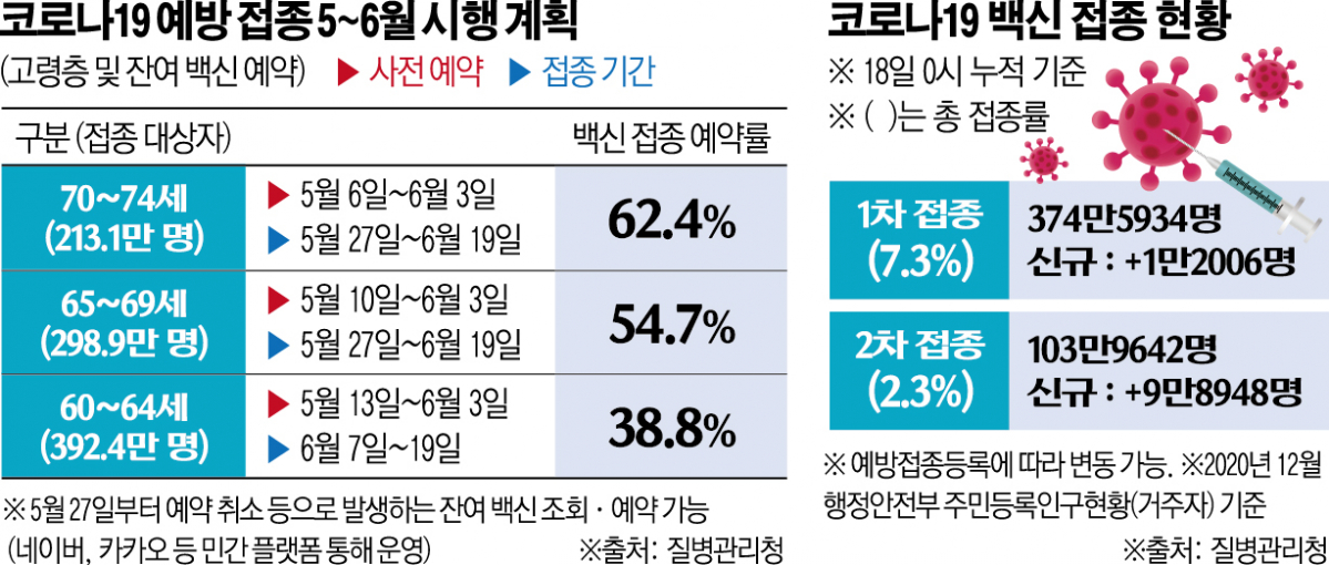 19일 중앙재난안전대책본부(이하 중대본)에 따르면 6일부터 순차적으로 시작된 60~74세 어르신 전체(911만 명) 백신(아스트라제네카) 접종 예약률은 이날 0시 기준 49.5%(451만 명)로 전날보다 2.3%포인트(P) 증가했다.