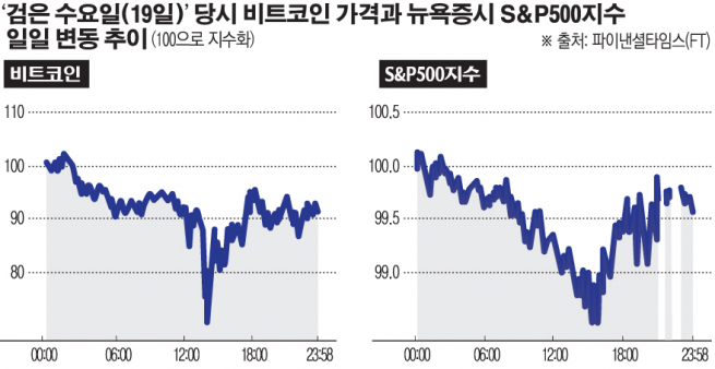 주목할만한 점은 이러한 비트코인 시장의 폭락세가 전통적인 자산에도 고스란히 전해졌다는 점이다. ‘검은 수요일’ 당시 다우지수와 S&P500지수 등 뉴욕증시 3대 지수는 일제히 하락했다. 안전자산으로 통하는 미국 국채를 비롯해 일부 국채 가격은 올랐고, 달러와 엔화 가치도 급등했다. 달러화 가치와 반대로 움직이는 유가는 3% 넘게 급락했다.