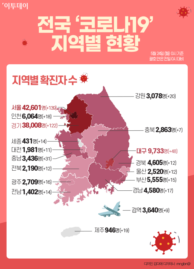 질병관리청 중앙방역대책본부에 따르면 5월 24일 0시 기준, 전일 0시 대비 538명이 추가 확진 판정을 받아 전국 확진자 수는 13만6467명으로 늘었다.