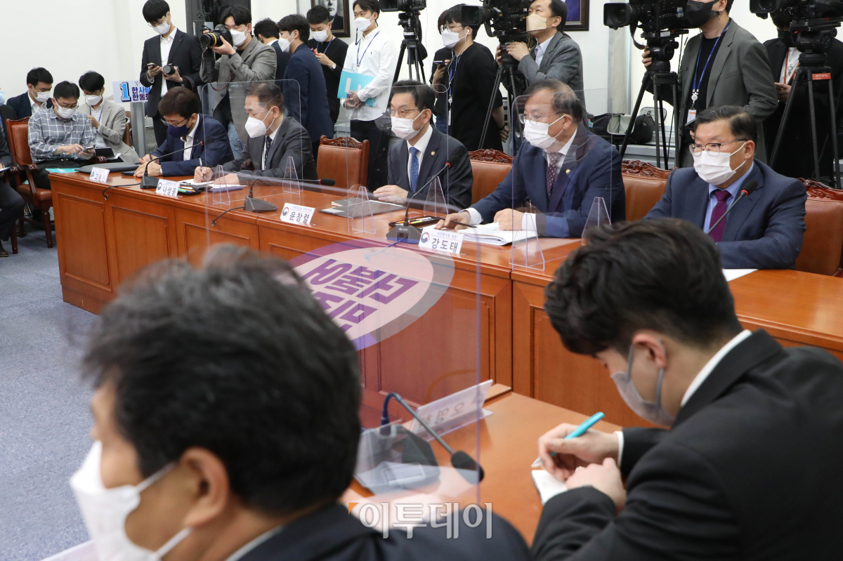 24일 오전 서울 여의도 국회에서 열린 더불어민주당 백신,치료제특별위원회 1차회의에서 식품의약품안전처 김진석 차장,보건복지부 강도태 차관,국무조정실 윤창렬 제2차장,질병관리청 나성웅 차장(윗줄 오른쪽부터)이 정부측을 대표해 참석을 하고 있다.