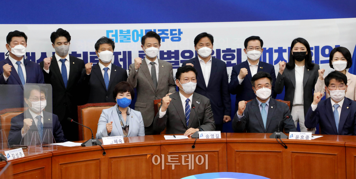 24일 오전 서울 여의도 국회에서 열린 더불어민주당 백신,치료제특별위원회 1차회의에 송영길 대표,윤호중 원내대표, 전혜숙 특별위원장(왼쪽에서 두번째)등이 참석해 기념촬영을 하고 있다.