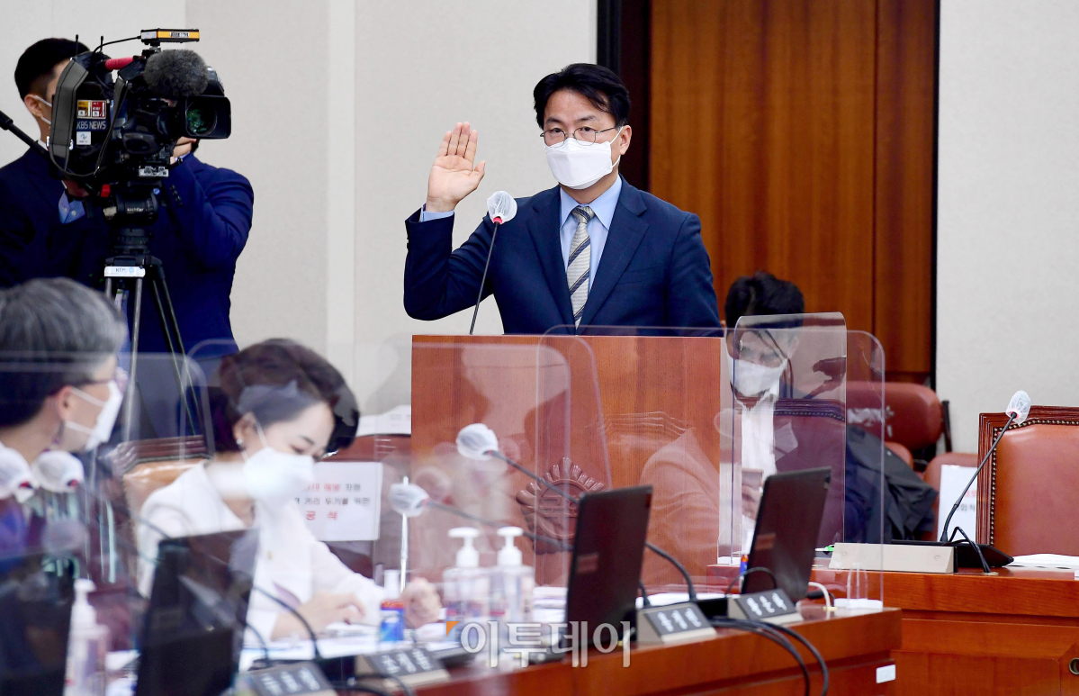 25일 서울 여의도 국회에서 열린 산업통상자원중소벤처기업위원회 손실보상법 입법청문회에서 조주현 중소벤처기업부 소상공인정책실장이 선서하고 있다.