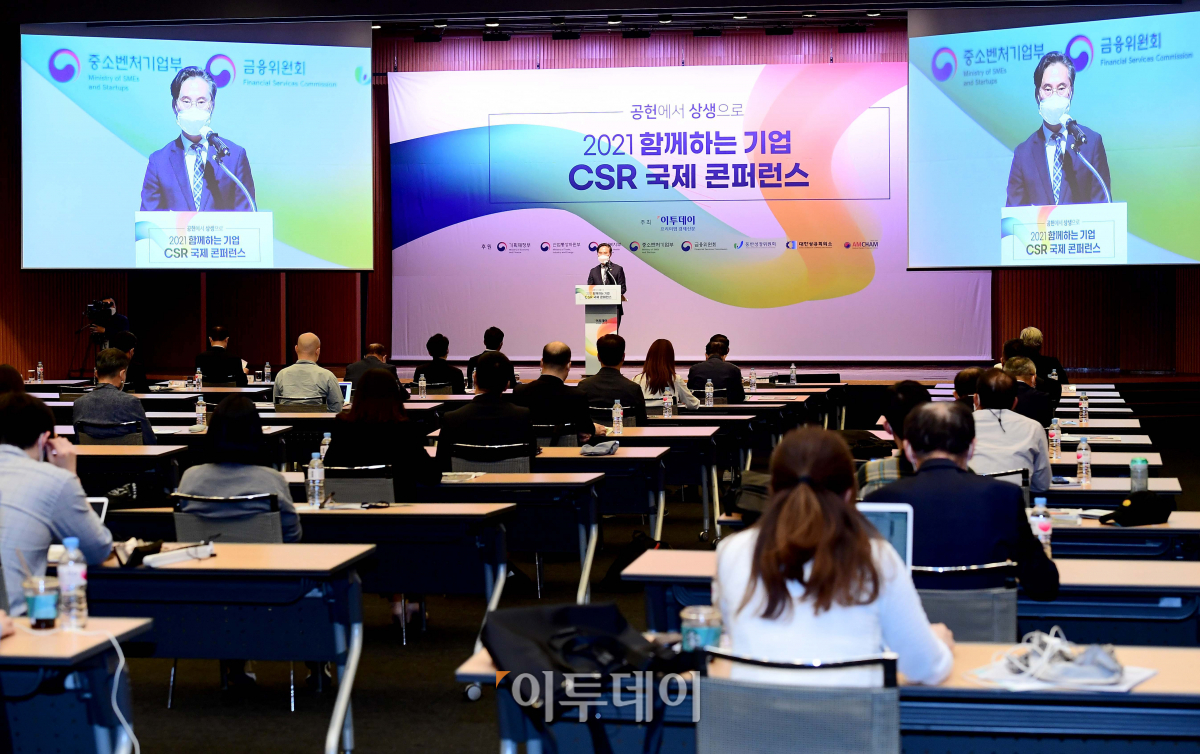 26일 서울 중구 대한상의 국제회의장에서 열린 ‘2021 함께하는 기업 CSR 국제콘퍼런스’에서 박진규 산업통상자원부 차관이 축사를 하고 있다. ‘공헌에서 상생으로’를 주제로 이투데이가 주최한 이번 행사에선 국내외 전문가들이 CSR과 ESG의 이상적인 사회적 연계방향과 비전을 논의했다.