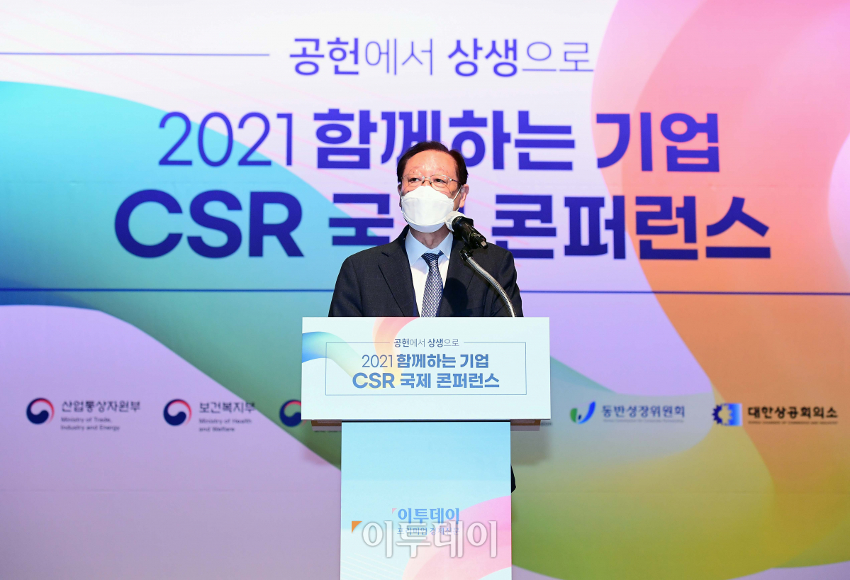 26일 서울 중구 대한상의 국제회의장에서 열린 ‘2021 함께하는 기업 CSR 국제콘퍼런스’에서 권기홍 동반성장위원회 위원장이 축사를 하고 있다. ‘공헌에서 상생으로’를 주제로 이투데이가 주최한 이번 행사에선 국내외 전문가들이 CSR과 ESG의 이상적인 사회적 연계방향과 비전을 논의했다.