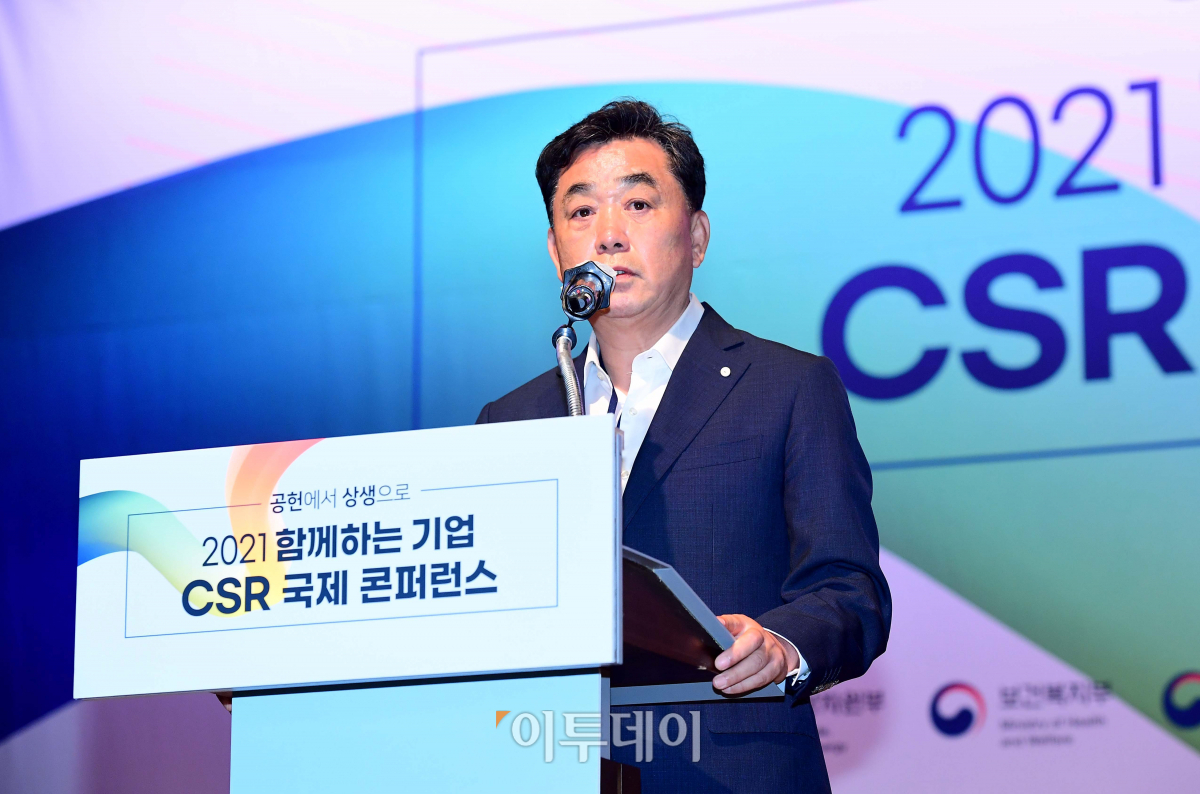 26일 서울 중구 대한상의 국제회의장에서 열린 ‘2021 함께하는 기업 CSR 국제콘퍼런스’에서 김상철 이투데이 대표이사가 환영사를 하고 있다. ‘공헌에서 상생으로’를 주제로 이투데이가 주최한 이번 행사에선 국내외 전문가들이 CSR과 ESG의 이상적인 사회적 연계방향과 비전을 논의했다.