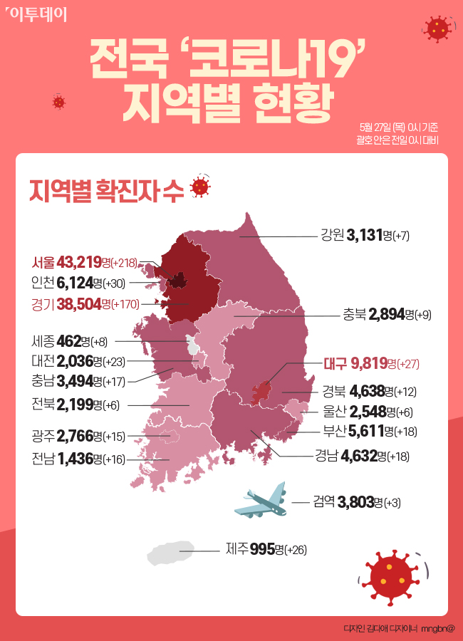 전국 시·도별 코로나19 누적 확진자 수는 △서울 4만3219명 △경기 3만8504명으로 가장 많은 비중을 차지했다. 이어 △대구 9819명 △인천 6124명 △부산 5611명 △경북 4638명 △경남 4632명 △검역 3803명 △충남 3494명 △강원 3131명 △충북 2894명 △광주 2766명 △울산 2548명 △전북 2199명 △대전 2036명 △전남 1436명 △제주 995명 △세종 462명 순으로 나타났다.