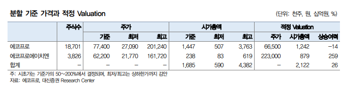 한상원 대신증권 연구원은 "분할 재상장 이후 적정 시가총액은 지주사(에코프로) 1조2400억 원, 사업 회사(에코프로에이치엔) 8800억 원으로 기존 합산 시가총액 2조2000억 원으로 평가한다"며 "거래정지 기간 동안 주식 시장은 약세(코스닥 -2.4%)를 보였으며, 지주사 가치 평가에 절대적인 영향을 미치는 자회사 에코프로비엠의 주가도 하락(-4.2%)했다"고 설명했다.