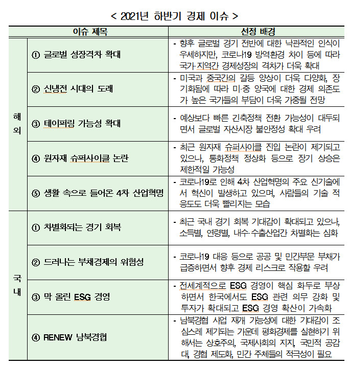 국내 경제이슈로는 △차별화된 경기 회복 △드러나는 부채경제 위험성 △막 올린 ESG 경영 △남북경협 기대감을 꼽았다.