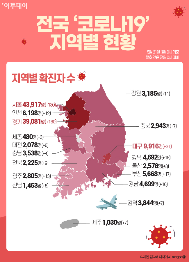 질병관리청 중앙방역대책본부에 따르면 5월 31일 0시 기준, 전일 0시 대비 430명이 추가 확진 판정을 받아 전국 확진자 수는 14만340명으로 늘었다.