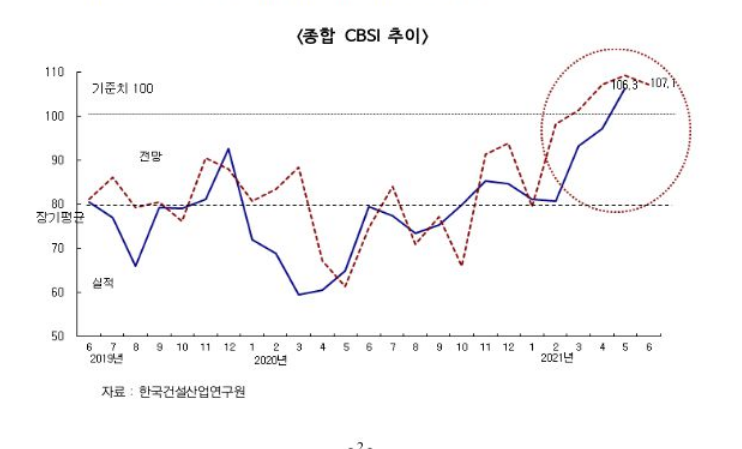 CBSI가 100을 넘어선 건 2015년 7월 이후 처음이다. 박철한 건산연 연구위원은 “전체 지수 흐름 및 수준을 토대로 판단한 결과 건설 경기가 전반적으로 회복국면에 있는 것으로 보인다”고 말했다.