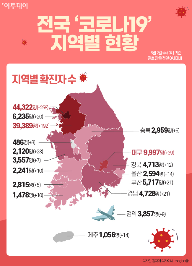 질병관리청은 6월 1일 하루 동안 전국적으로 총 677명의 신종 코로나바이러스 감염증(코로나19) 확진자가 추가로 확인됐다고 밝혔다. 전날보다 218명 늘었다. 6월 2일 0시 기준 국내 코로나19 누적 확진자 수는 14만1476명이다.