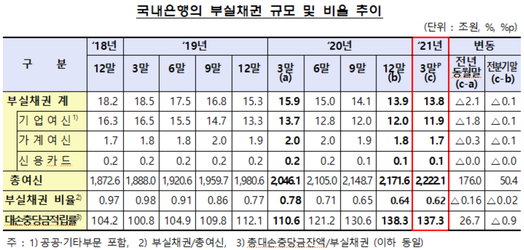 같은 기간 국내 은행의 부실채권은 13조8000억 원으로 전분기말 대비 1000억 원 감소했다.