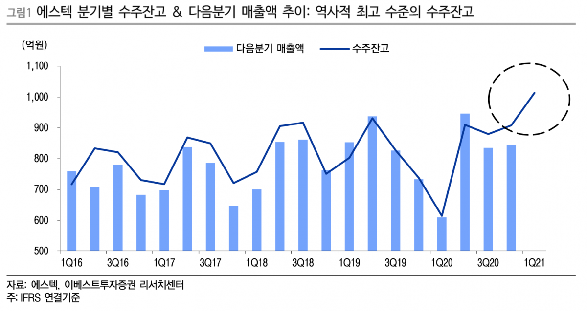 정홍식 이베스트투자증권 연구원은 “에스텍의 1분기 수주잔고는 1013억 원으로 역사적 최고치 수준을 기록했다”며 “2분기 매출이 분기 최대 수준으로 이어질 가능성이 매우 높다고 해석할 수 있다”고 말했다.