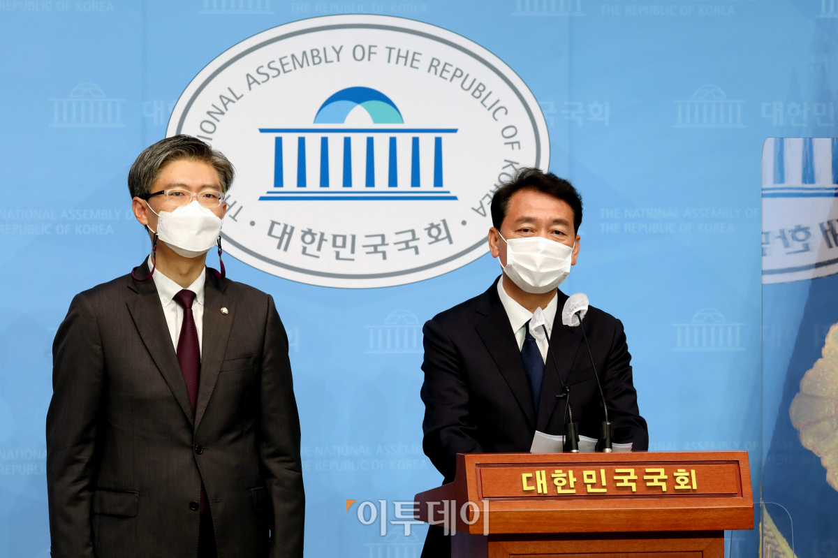 이광재 더불어민주당 의원(오른쪽)과 조정훈 시대전환 의원이 3일 오전 국회 소통관에서 기자회견을 열고 '양극화 해소·삶의 질 향상을 위한 시대전환 미래비전 공동성명'을 발표하고 있다.