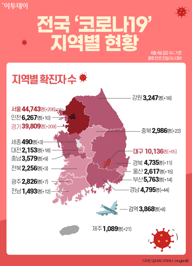 비수도권에서는 부산(13명), 대구(65명), 울산(14명), 경북(8명), 경남(43명) 등 영남권(143명)의 신규 확진자가 계속해서 급증했다.