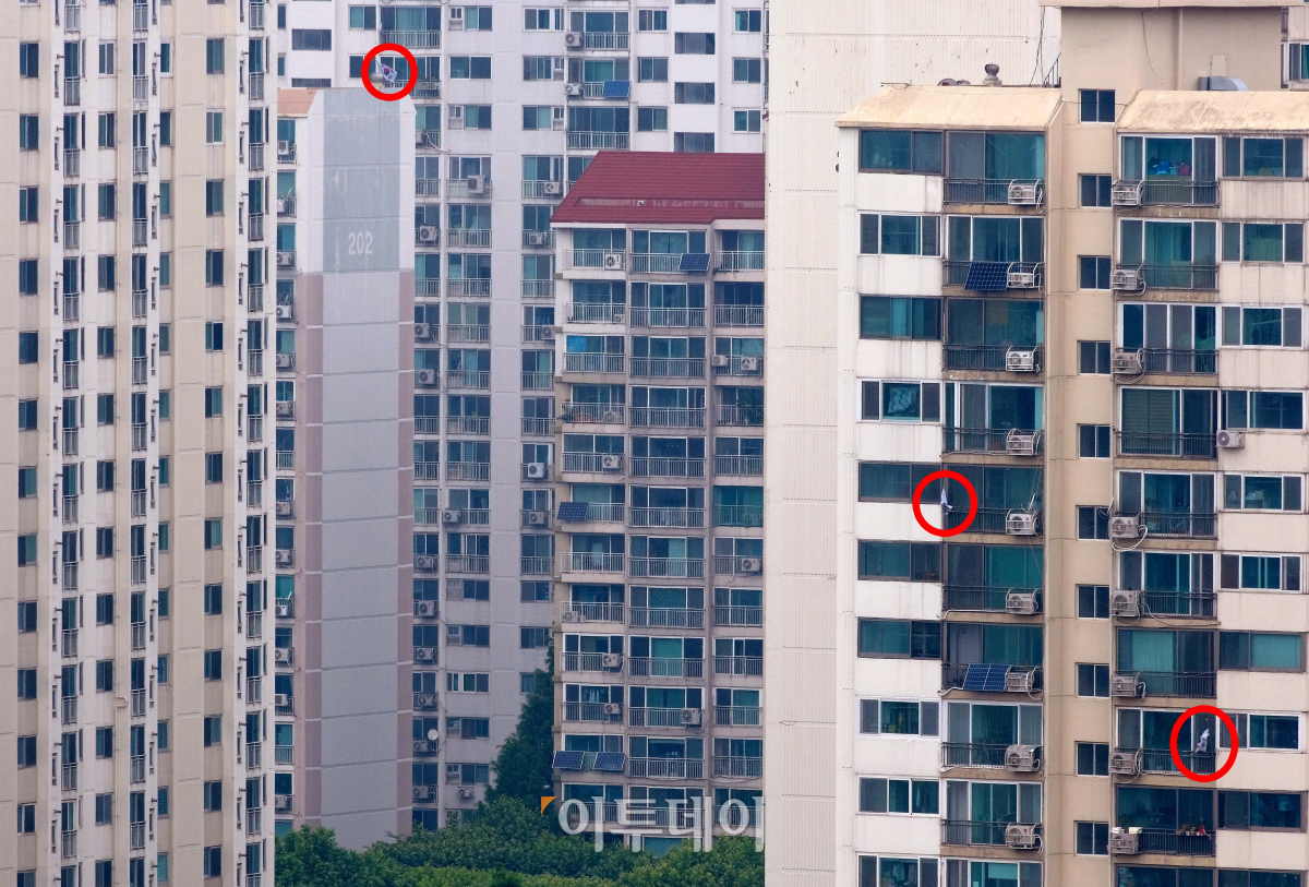 제66회 현충일인 6일 서울의 한 아파트 단지에 조기게양률이 낮은 모습을 보이고 있다.