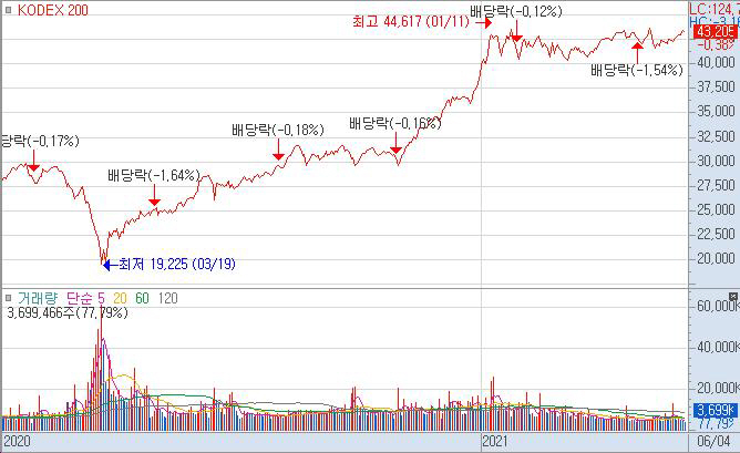 KODEX200은 국내 최대 ETF로 하루 평균 거래대금은 약 2000억 원 내외 수준이다. 같은 코스피200을 추종하는 미래에셋자산운용의 타이거200(TIGER 200)은 일 평균 400억 원 내외의 거래대금을 기록하고 있다.