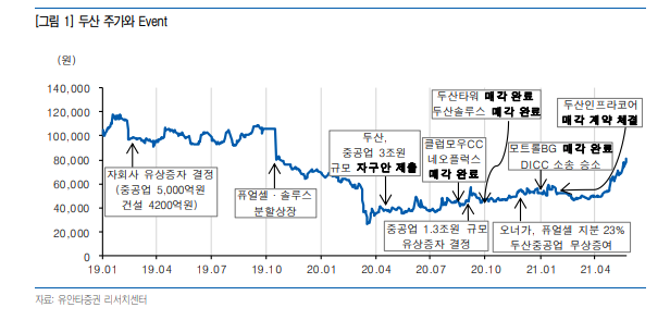 최남곤 유안타증권 연구원은 “지난 10년 동안 두산 그룹을 재무적으로 괴롭힌 문제가 마무리 단계에 진입했다”며 “두산건설의 부실과 이를 살리기 위한 두산그룹이 무리수를 둔 가운데, 채권단 관리는 그룹의 지속 가능성 관점에서 신의 한 수였다”고 설명했다.