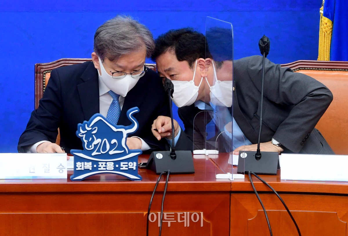 권칠승(왼쪽) 중소벤처기업부 장관과 송갑석 더불어민주당 산자위 간사가 7일 서울 여의도 국회에서 열린 소상공인 손실보상 법제화를 위한 당정협의에서 대화하고 있다.