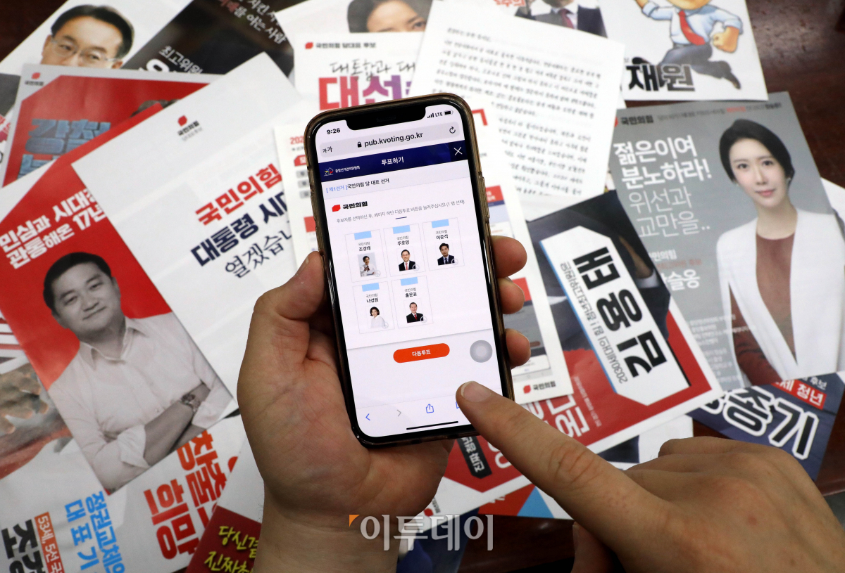 7일 오전 서울 여의도 국회에서 국민의힘 당원이 전당대회를 앞두고 2021 국민의힘 당 대표및 최고위원 모바일 투표를 하고 있다.선거인단은 전당대회 대의원, 책임당원, 일반당원 등 32만8천여명으로 구성됐으며, 7~8일 모바일 투표, 9~10일 자동응답시스템(ARS) 투표로 진행된다. 일반 시민 여론조사는 9~10일 이틀간 진행된다.