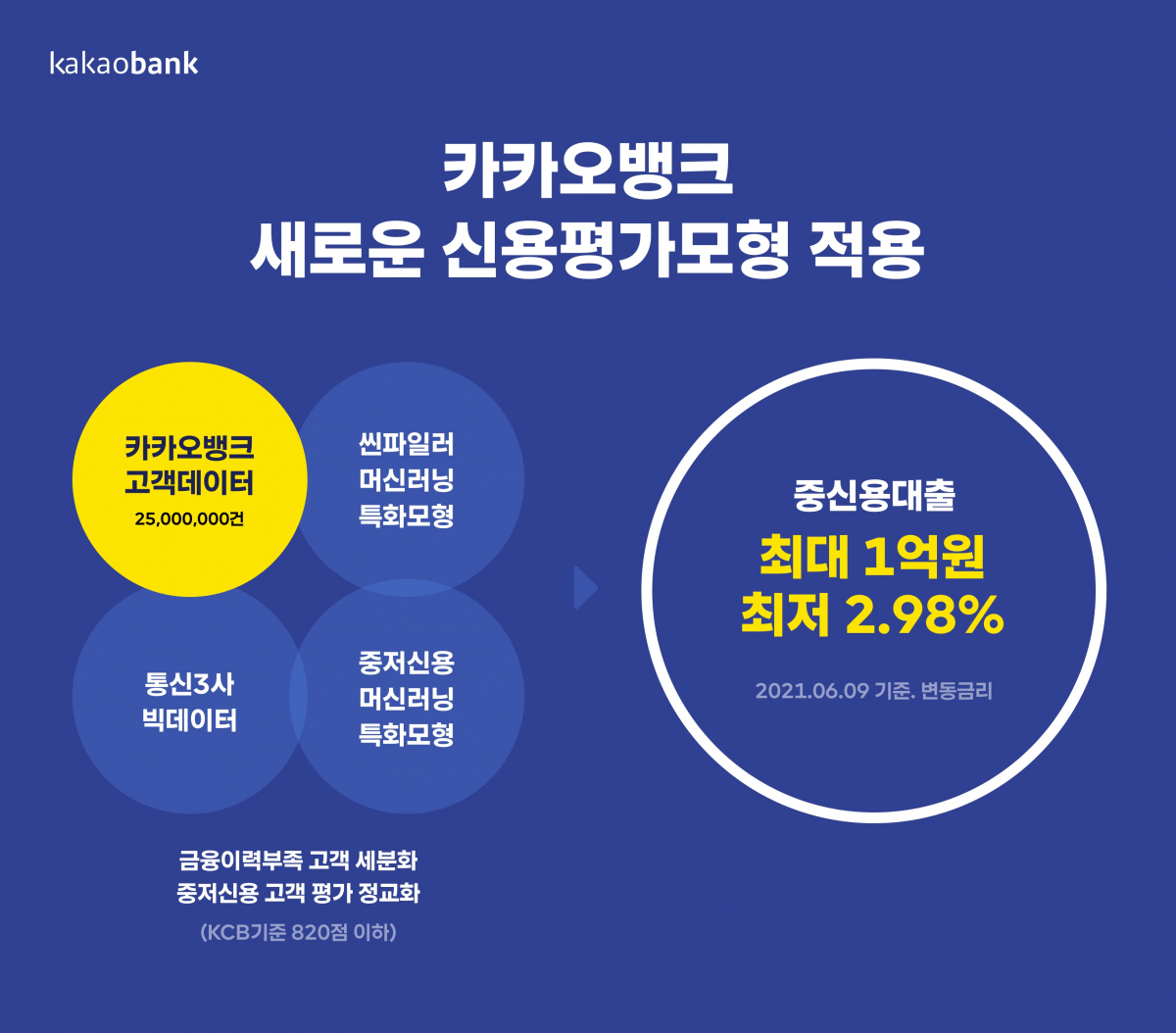 카카오뱅크는 9일 오전 6시부터 새로운 신용평가모형을 적용하고, 신용점수(KCB 기준) 820점 이하 고객들이 이용할 수 있는 ‘중신용대출’ 상품의 최대 한도를 1억 원으로 확대했다. 또 ‘중신용대출’ 상품의 가산금리도 1.50%포인트 가량 인하해 이날 기준 최저금리는 2.98%다.