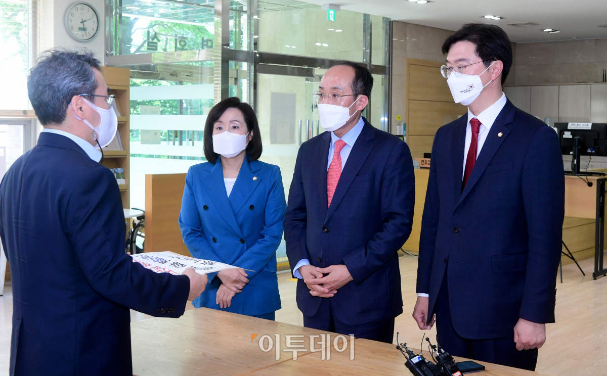 추경호(가운데) 국민의힘 원내수석부대표, 강민국(오른쪽) 원내대변인, 전주혜 원내대변인이 9일 서울 종로구 감사원에 국민의힘 국회의원 부동산 투기 전수조사를 의뢰하고 있다.