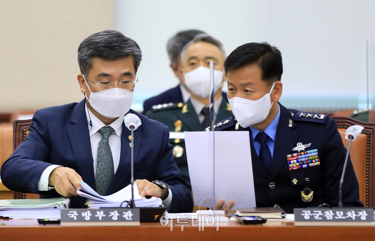 서욱 국방부 장관(왼쪽)이 9일 서울 여의도 국회에서 열린 국방위원회 전체회의에 출석해 공군 성폭력 관련 긴급 현안보고를 앞두고 정상화 공군참모차장과 대화하고 있다.