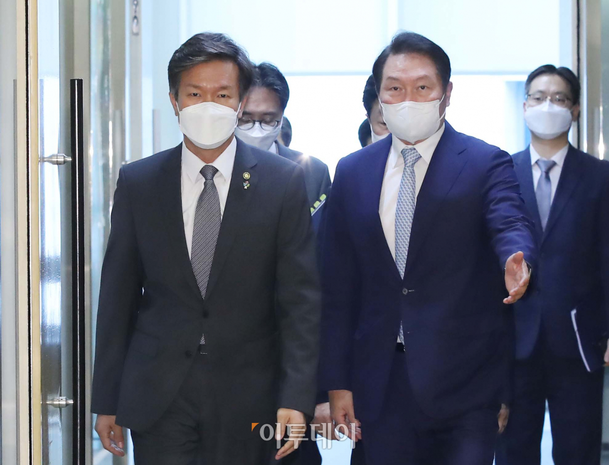 최태원 대한상공회의소 회장과 김대지(왼쪽) 국세청장이 10일 오후 서울 중구 대한상의에서 열린 국세청장-대한·서울 상의 회장단 간담회에서 입장하고 있다.