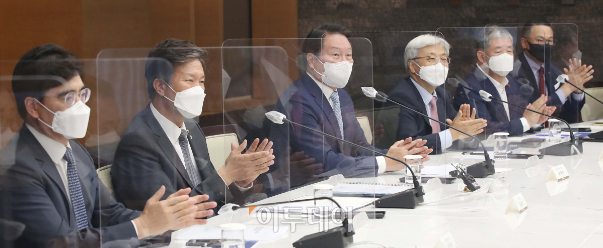 10일 오후 서울 중구 대한상공회의소에서 열린 국세청장-대한·서울상의 회장단 간담회에서 최태원 대한상공회의소 회장 등 상의 회장단과 김대지 국세청장이 박수치고 있다. 왼쪽부터 공영운 현대자동차 사장, 김대지 국세청장, 최태원 회장, 이인용 삼성전자 사장, 정태희 대전상공회의소 회장, 이동우 롯데지주 사장.