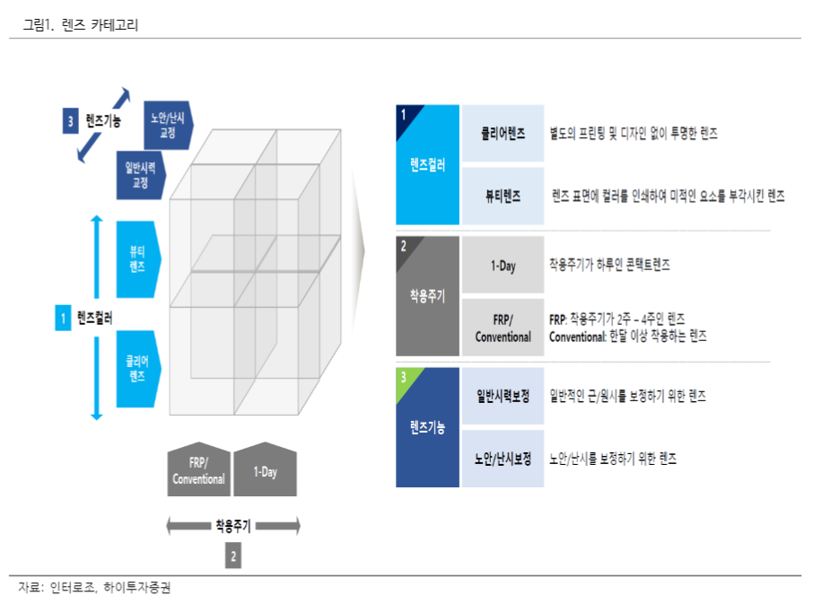 이상헌 하이투자증권 연구원은 "이 회사는 2000년 설립된 콘택트렌즈 제조·판매 전문업체로서 자체 브랜드 클라렌 외에도 CEM/ODM 형태로도 매출이 발생하고 있다"며 "콘택트렌즈의 경우 착용 주기(1일, 1달 이내, 1달 초과), 용도(시력 교정, 미용, 치료 등), 소재(하이드로겔, 실리콘 하이드로겔 등) 별로 종류가 다양하다"고 설명했다.