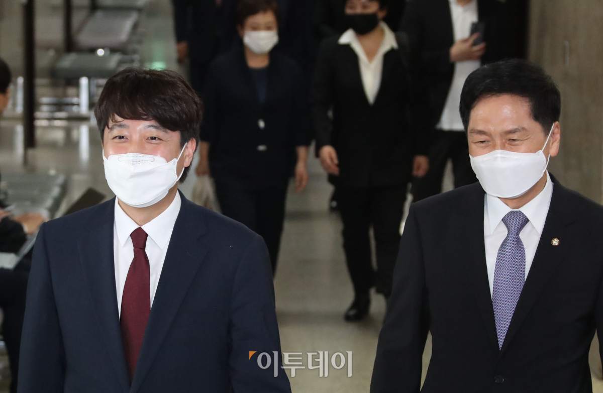 국민의힘 이준석 대표가 김기현 원내대표, 새로 선출된 최고위원 들과 함께 14일 오후 서울 여의도 국회에서 열린 첫 최고위원회의에 입장하고 있다.