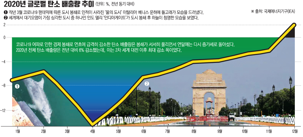 2019년 말부터 전 세계를 강타한 신종 코로나바이러스 감염증(코로나19)은 지구온난화로 기후 재앙 위기에 놓인 인류에 뜻밖의 희망을 보여줬다. 코로나19로 인간의 바깥 활동과 산업 활동이 줄면서 잠시였지만, 탄소 배출량이 전례 없이 줄어든 것이다.