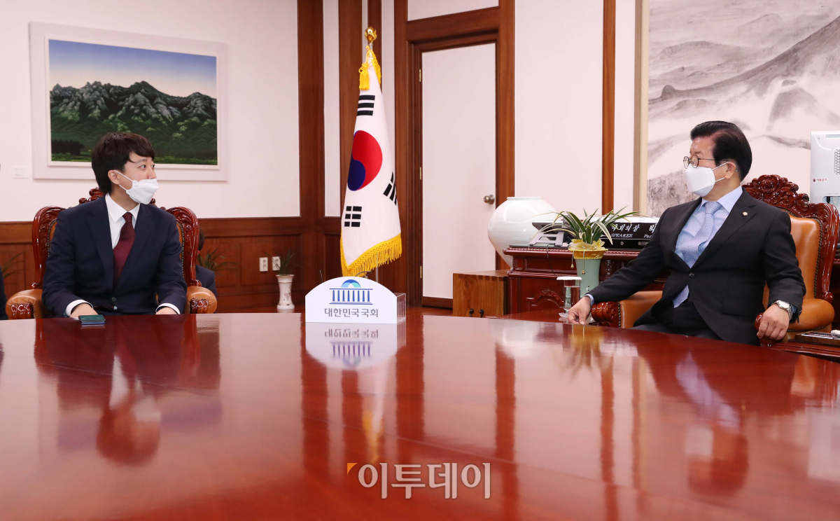 이준석 국민의힘 대표가 14일 서울 여의도 국회에서 박병석 국회의장을 예방해 환담하고 있다.