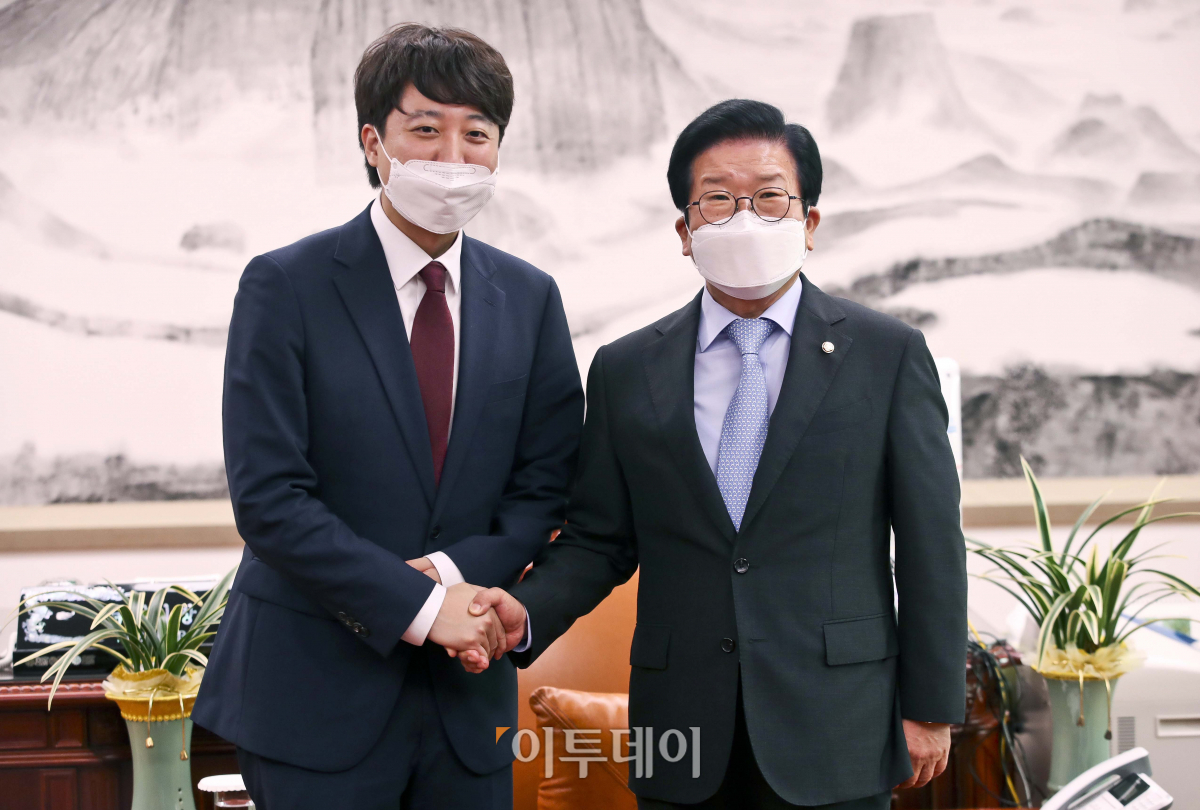 박병석 국회의장(오른쪽)이 14일 오후 서울 여의도 국회 의장실을 예방한 국민의힘 이준석 신임 당 대표와 기념촬영을 하고 있다.
