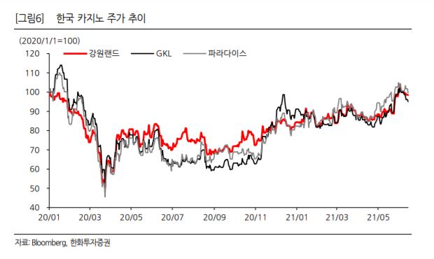 지 연구원은 글로벌 카지노 시장 환경이 빠르게 회복되고 있다고 주목했다. 그는 “카지노는 글로벌 피어와 주고 동조화가 강하고 코로나 사태는 전 세계적으로 경험한 악재였다는 점에서 주가 상대비교가 여전히 중요하다”고 설명했다.