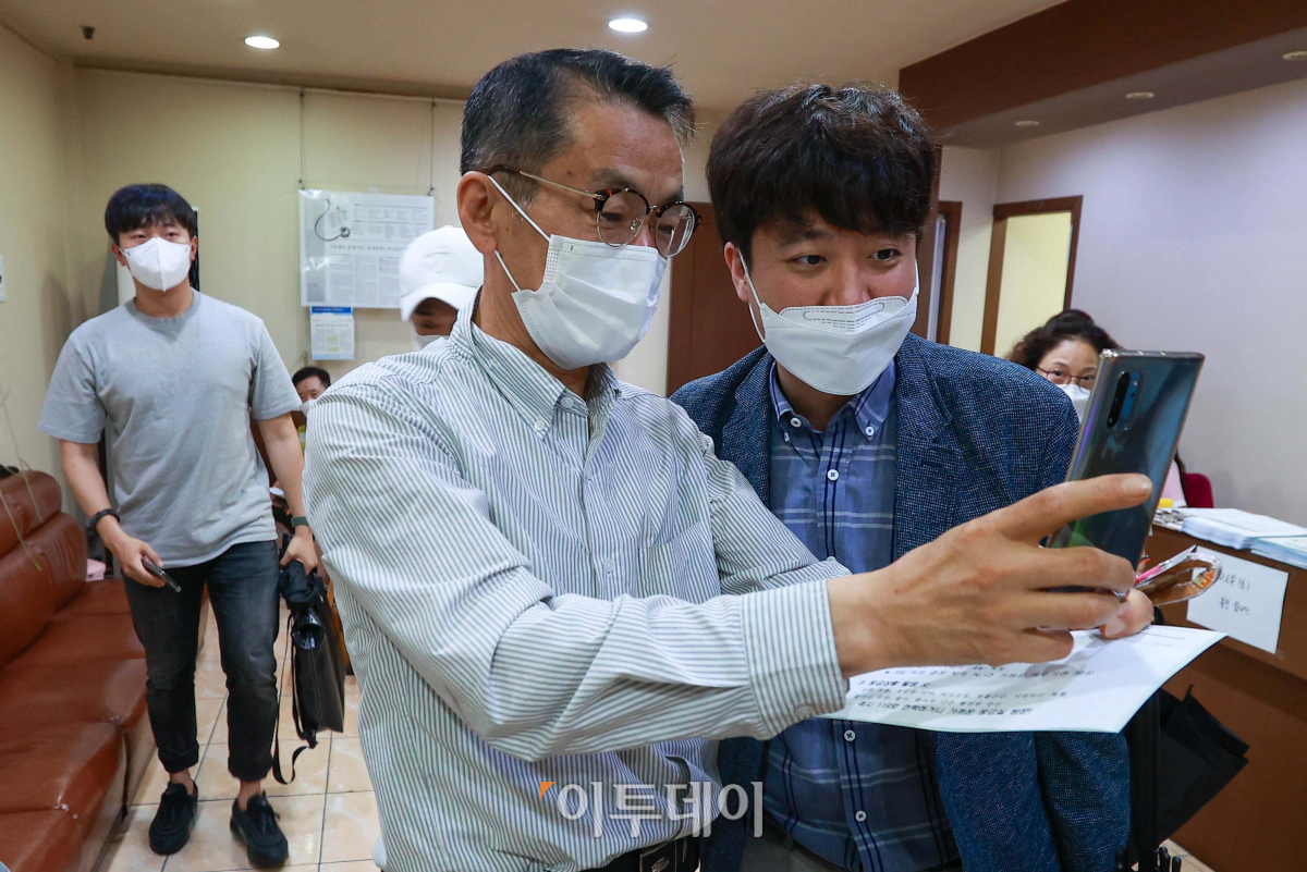 민방위 대원인 이준석 국민의힘 대표가 15일 오전 서울 노원구 한 병원에서 코로나19 백신(얀센)을 접종했다. 접종을 마친 뒤 시민들의 요청으로 기념촬영을 하고 있다. 국회사진취재단