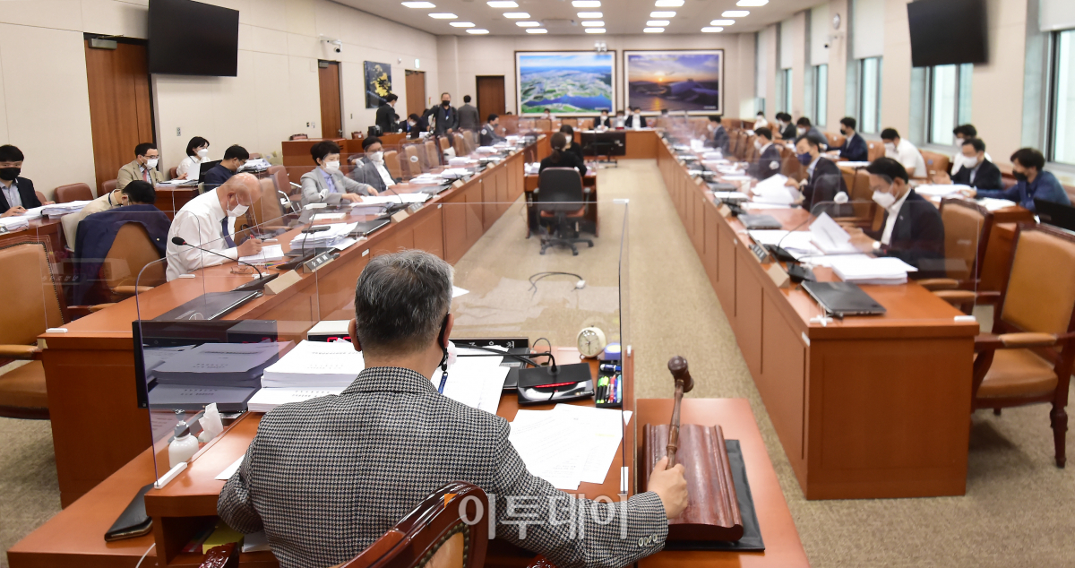 조응천 소위원장(뒷모습)이 15일 서울 여의도 국회에서 열린 제2차 국토교통위원회 국토법안심사소위원회에 참석, 의사봉을 두드리며 안건 상정을 알리고 있다.